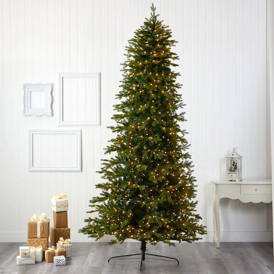 Create a traditional Christmas scene in your home or office with the help of this easy and effortless artificial Christmas tree! Completely maintenance-free, this realistic looking fake Christmas tree boasts multiple tiers of natural looking fir foliage made up of easy-to-bend branches, perfect for showcasing your favorite holiday ornaments. Arriving pre-strung with clear LED lights to eliminate tangles and carefully stabilized on a metal stand, this impressive 10ft. tall artificial Christmas tree will not only make decorating a breeze but ensure your home is always seasonally attired for years to come.