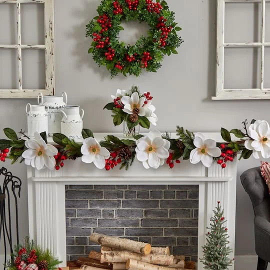 12″ Magnolia, Pine & Berry Arrangement In Glass Vase