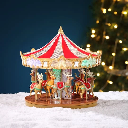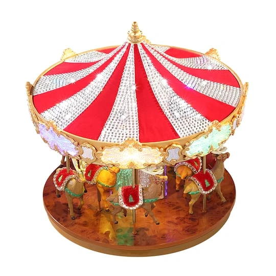 The Swarovski holiday carousel from Mr. Christmas is the glamorous holiday centerpiece your collection is missing. A smiling Santa in his sleigh waves while his adorable reindeer rise and fall as the carousel turns. 32 LED lights illuminate through the multicolored panels and over 1,000 Swarovski crystals decorate the roof and animals creating a dazzling display as the carousel rotates. This adaptor-operated carousel plays 25 of your favorite Christmas carols, and built-in volume control allows you to enjoy with or without music.