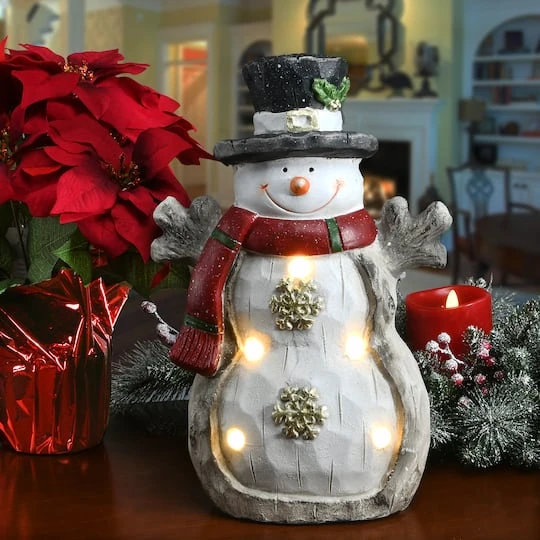 This decorative seasonal piece is constructed of strong polyresin material featuring handcrafted and hand-painted detail. This smiling snowman is wrapped in a cozy cap and scarf and features a wood-look design. Battery powered LED light shines from inside through cutouts in the body for a soft glow.