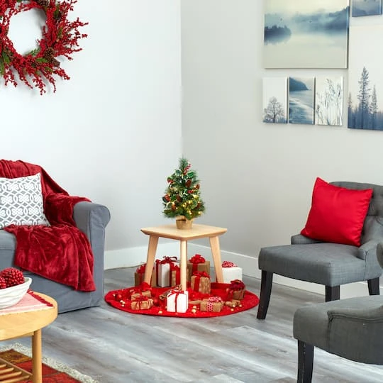 Complete the holiday scene with this frosted artificial Christmas tree boasting a collection of evergreen foliage made up of easy-to-bend branches to hang ornaments and accented with faux pinecones and berries that look realistic. Dusted with faux snow, this 1.5’ tall frosted Christmas tree comes pre-strung with 35 clear LED lights (battery operated) and stabilized in a decorative container to help create a holiday statement for years to come.