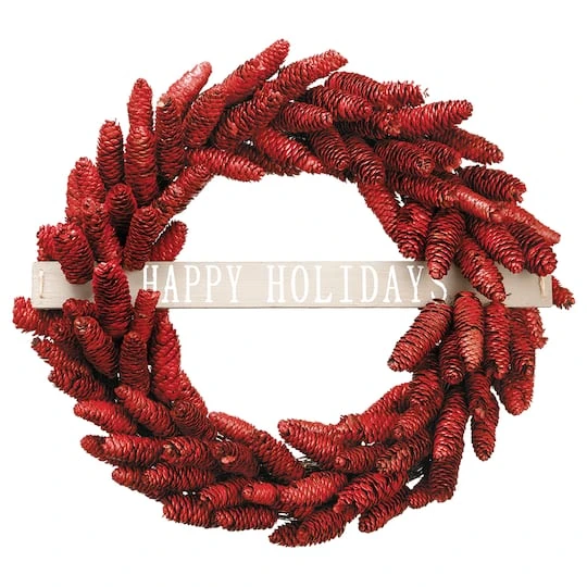 This “Happy Holidays” pinecone wreath is perfect for adding a festive touch to any room. Hang it on your front door with matching garland for a festive look.