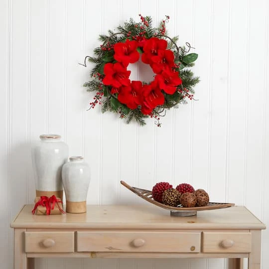 Here’s a holiday decoration that will grace your wall, door or mantle for years to come. This large amaryllis wreath is bright, cheery and full of holiday spirit. With full blooms, a variety of greens and berries, and a cornucopia of twisting twigs and leaves, this wreath will look different every time you gaze upon it. Plus, it’ll never dry out. Makes a fine home or office decoration, and an ideal gift as well.