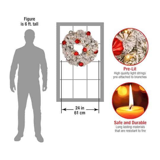 The Snowy Bristle Pine features wide bristle branch tips sprinkled with snow and trimmed with shiny red and silver ball ornaments. It is pre-strung with 50 battery-operated warm white LED lights that are energy-efficient and long lasting. 6 hours on/18 hours off timed operation. This wreath can be displayed on doors, walls and windows in indoor or outdoor locations.