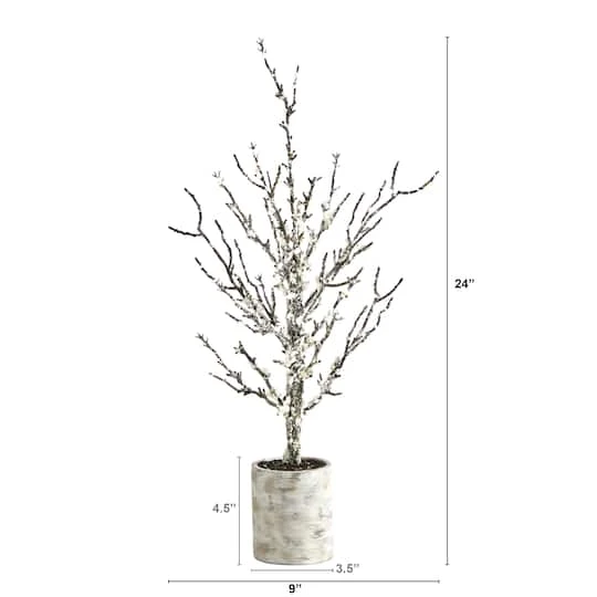 Create your own winter wonderland with a minimalist approach with the help of this artificial tree. Sparse by design, it features countless of bendable branches stemming from a single, stabilized trunk – all frosted with a light dusting of snow faux to evoke a magical winter setting. Standing 24”’ high stabilized in a decorative planter, this seasonal accent would make for an enchanting addition to your holiday decor scheme.