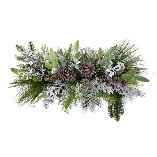 Are you into trendy décor? If yes, you’ll faux for this artificial arrangement. Flocked evergreen leaves with distinct textures point in different directions for a messy yet modern look. Accented by faux snowed pinecones that inject color and subtly calms the look, add a natural touch to any tablespace. With a length of 26″. add to any holiday-inspired space.