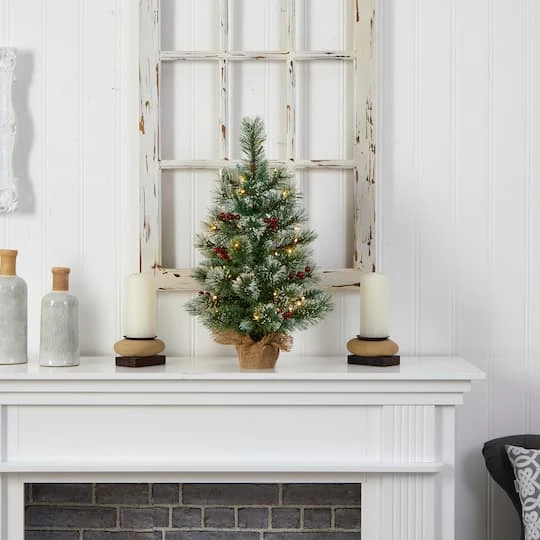 Spread holiday cheer to any tabletop with this artificial Pine Berry Christmas Tree. Lush, PVC needles are lightly dusted with snow and accented throughout with berries that look incredibly lifelike. This mini faux tree comes pre-lit with 35 lights and 50 bendable branches to save you time and money. Standing 2ft. from a burlap base for a rustic vibe, house in any area.