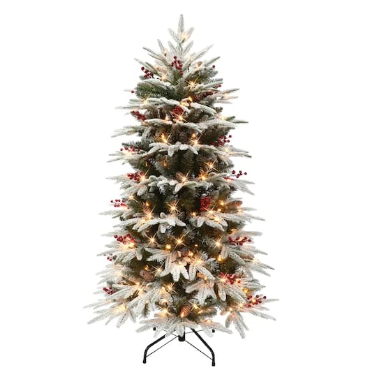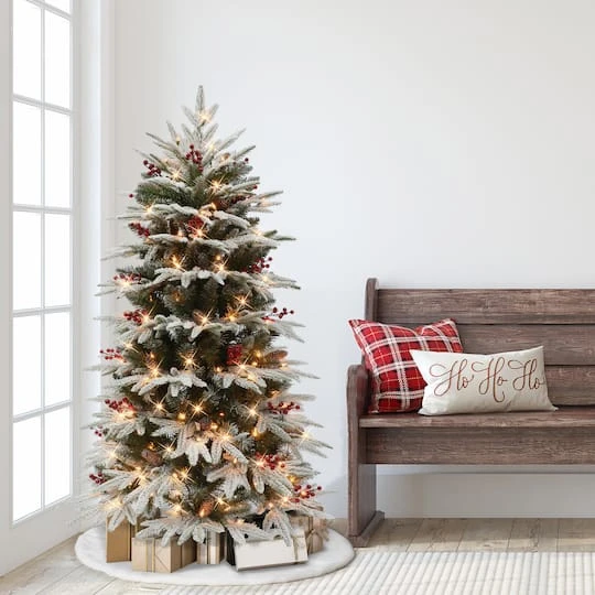 Embrace the joy of the holiday season into your home with the Puleo International Pre-Lit Flocked Slim Halifax Fir Christmas Tree. This 4.5-foot tall artificial holiday tree with elegant snow-dusted pine needles, rich-colored berries, and realistic pine cones perfectly captures the ambiance of the wintry forests in your home. Decorated with 200 pre-attached UL-listed clear incandescent lights, this pre-lit tree illuminates your home with a dazzling festive glow while eliminating the time-consuming hassle of hanging lights around your tree. The snow flocked Halifax fir tree has a full and natural appearance with a total of 985 branch tips, gorgeous life-like branches, and a classic conical shape for an authentic wintry forest impression. With a streamlined slim design, this tree fits effectively in smaller spaces in your home such as corners and hallways for an easier and more versatile display. Assembly is simple and quick with easy to hinge branches, and a metal stand is included for convenient placement anywhere in your home.