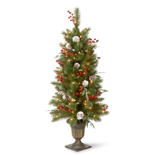 This Frosted Pine Berry Entrance Tree is a welcoming addition to a doorway, deck, porch or patio. Trimmed with white-tipped pine cones, red berries and eucalyptus leaves, this tree is pre-lit with 70 clear lights that remain lit even if a bulb burns out. Display this attractive greenery in any indoor or covered outdoor location.