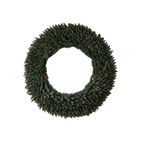 Add the WOW factor to your holiday décor with this flocked artificial Christmas wreath intricately designed from realistic looking pine foliage in a palette of seasonal evergreens flocked in a coat of faux-snow, carefully accented throughout with faux pinecones and berries that look incredibly realistic. Arriving pre-strung with 400 clear LED lights to effortlessly illuminate either a large wall or door, this 5 ft. (in diameter) decorative wreath makes for an inviting accent and will undoubtedly transform any entrance all throughout the holiday season. Perfect for a large space in need of some holiday cheer. Artificial wreaths are manufactured using synthetic materials, such as polyester material or plastic, and are well designed and constructed to be life-like in appearance. This item will need to be re-shaped when removed from the secure box to allow it to reach its fullest size. Your wreath will look beautiful for years to come; simply wipe clean with a soft dry cloth when needed.