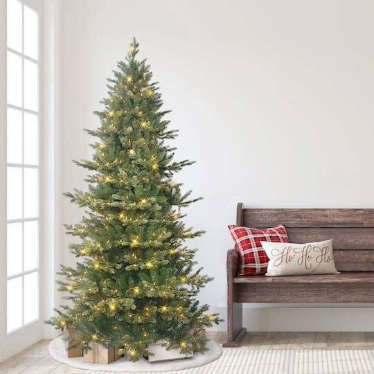 Usher in the holidays with this beautifully-crafted Royal Majestic Douglas Fir Christmas tree. Made to look and feel lifelike, the stunning realism of this tree is defined by its close attention to detail like pine needle branches and 1,862 PE/PVC tips for a touch of the magical winter wonderland. It comes pre-lit with 350 UL clear bulbs that will illuminate your space with a festive glow. Pre-strung bulbs simplify the otherwise time-consuming task of hanging lights on the tree. Made with strong and durable steel components, this Xmas tree is built to last. Flame retardant and hypoallergenic materials make it a safer choice when compared to real trees. Hinged branches are quick and easy to shape, ready to be decorated with your favorite ornaments. Its slim profile is ideal for smaller spaces. This product is backed by a 5-year warranty on the tree and a 2-year warranty on lights for years of quality use.