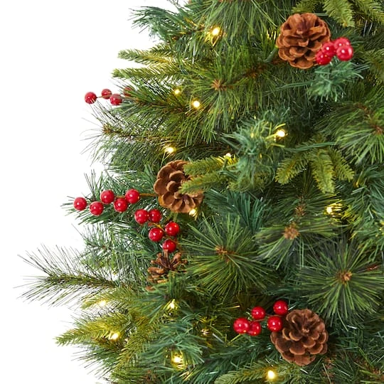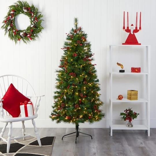 Create a picture-perfect Christmas setting in your home or office with this festive artificial Christmas tree! Easy to build and completely maintenance-free, this realistic looking Christmas tree boasts a mixed collection of pine foliage made up of easy-to-bend branches, accented throughout with faux pinecones and holly berries that look incredibly realistic. Arriving pre-strung with clear LED lights to eliminate tangles and carefully stabilized on a metal stand, this joyful 6ft. tall artificial Christmas tree will not only make decorating a breeze but ensure your home is always seasonally attired for years to come.