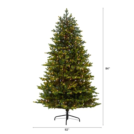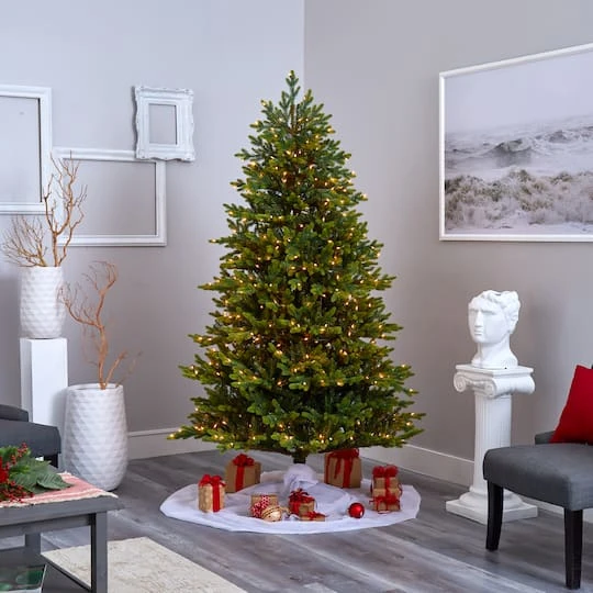 Create a traditional holiday scene in your home or office with the help of this artificial Christmas tree. Completely maintenance-free, this realistic looking fake Christmas tree boasts a robust silhouette of seasonal evergreens made up of bendable branch tips for decorating with your own personalized ornaments. Arriving pre-strung with clear LED lights to eliminate tangles and carefully stabilized on a metal stand, this traditional 7 foot tall artificial Christmas tree will not only make decorating a breeze but ensure your home is always seasonally attired for years to come.