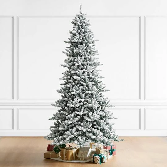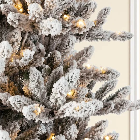 This 9ft. pre-lit snow flocked fir artificial Christmas tree creates a unique wintery feel. It will be an eye-catching addition to any room during the Christmas holidays.