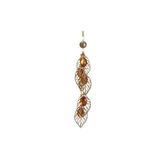 Redefine the art of elegance with this pendant Christmas ornament. It depicts multiple freely hanging gold-glittered leaves embellished with multi-faceted amber jewels and amber beading. This double-sided ornament comes ready-to-hang on a gold ribbon as a depiction of beauty!