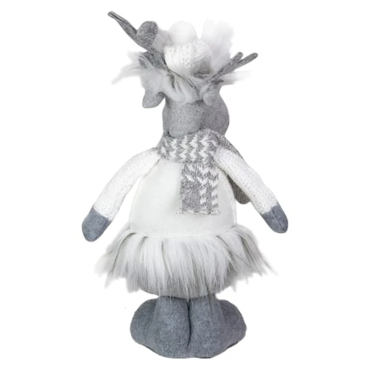 Calling all moose lovers! The moose has a large bulbous snout and a cute little round gray nose and is dressed for the cold winter months, ready to warm your house with his presence! He is wearing a white knit sweater and winter hat that has a puff on top. His feet are weighted for stability. This adorable moose is ready to join in your holiday festivities and waiting patiently to bring a smile to your friends and family.