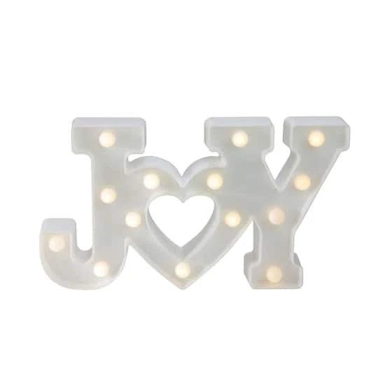 Deck the walls with our modern lighted Joy marquee sign. The “O” is uniquely shaped like a heart. It is a wonderful addition to your Christmas décor this season. The sign is lined with warm bright lights give off a soft glow.