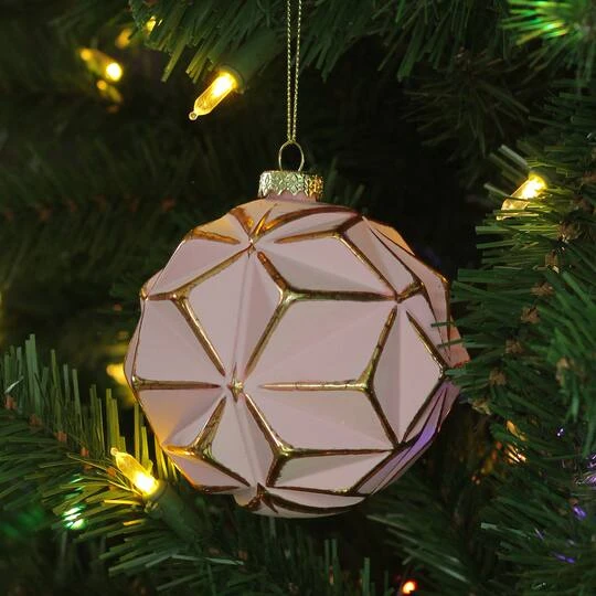 Take your holiday decorating up a notch with this matte pink and gold ball ornament from the Vintage Romance Collection. With the gold accents and modern geometric design, this ornament will fit with any holiday theme. Add to your tree for a pop of color. It can even be used for baby shower decorations.