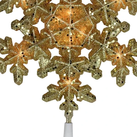 Light up your holiday decorations with this gorgeous gold snowflake tree topper. The clear lights illuminate not only the star itself but cast a warm rich glow. Add a bit of glamour with this unique snowflake tree topper.