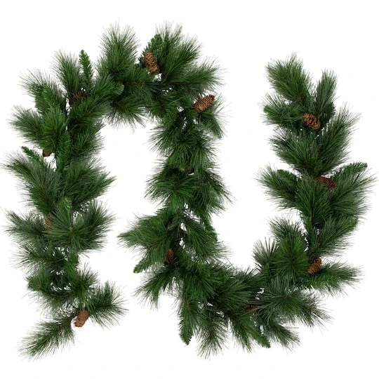 Make your Christmas décor lush and luxurious with this garland. The deluxe White Valley Pine series garland has thick two-toned verdant tips and long needle pine to create a full luxurious look. The alternating tips and pine cones add dimension and realism to the series. Decorate with ornaments, ribbon, or lights, or leave plain for a simpler look. The bendable wire center allows for you to shape the garland any way you desire, and green metal hooks on each end make for easy hanging.