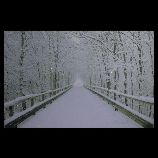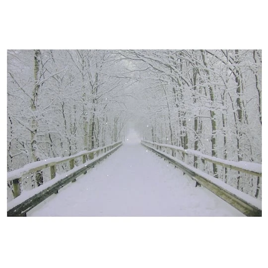 There’s something so pristine about freshly fallen snow. This winter scene depicts a snow covered wooden bridge among mighty snow dusted trees. Pre-lit with fiber optic pure white lights giving the illusion of falling snow.
