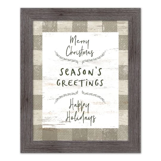 - Taupe and cream buffalo check border with green and white print in gray woodgrain frame